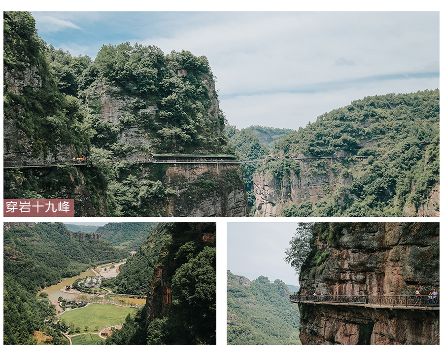 景区内的飞龙栈道依山势而造,曲折盘旋二十余处山坳,其中有128米为玻璃悬空栈道。栈道将十九峰景区的奇峰、山泉、怪石、洞穴、地缝、古藤、等旖旎风光连成一体,是迄今为止最有特色的观光栈道。