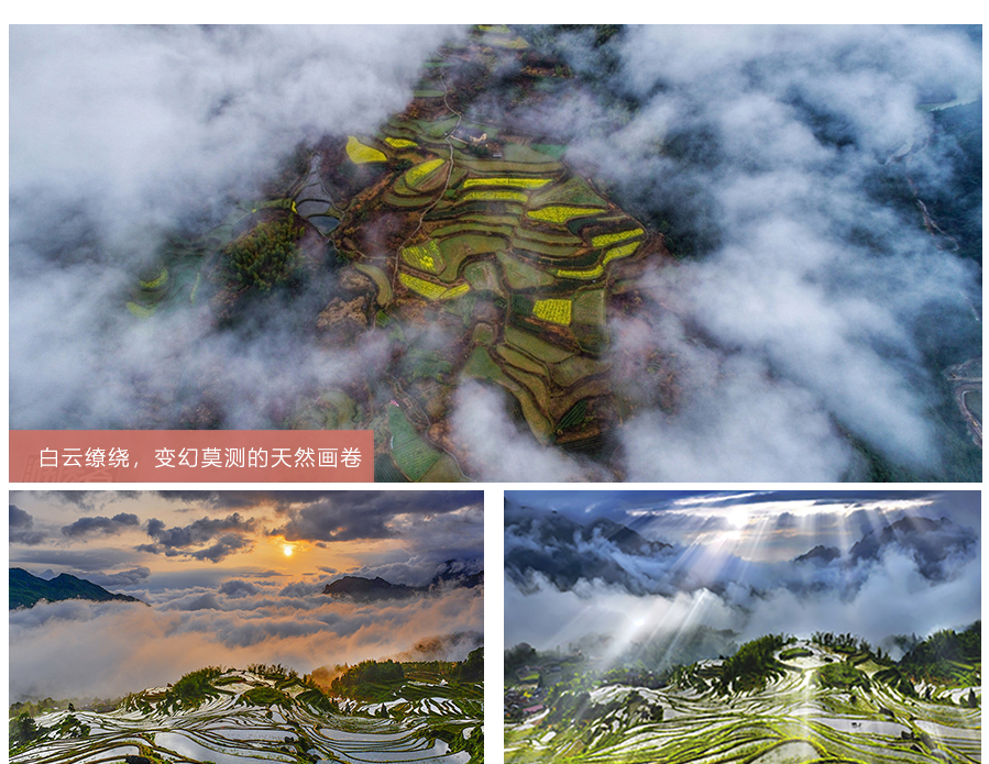 田中的水和河谷中的水蒸发而上,受气流影响而形成云海,水份又被林木充分吸纳,化为云雾烟雨,驻于高山丛林, 山巅与田间时常白云缭绕,使之出现虚实与层次,组成一幅幅变幻莫测的天然画卷